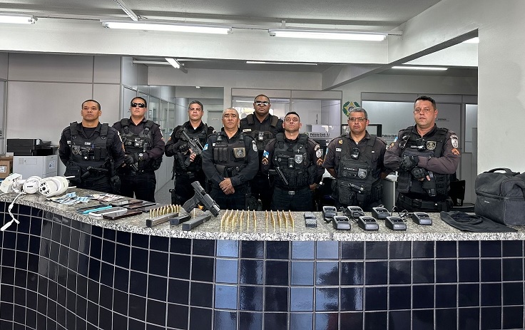 Segundo a PM, foram apreendidos: 1 pistola com numeração suprimida, ⁠02 carregadores alongados 9 milímetros , ⁠02 carregadores de 40 milímetros, ⁠26 munições calibre 40, ⁠93 munições 9 milímetros, ⁠01 munição de calibre 38, ⁠02 câmeras de vigilância, ⁠06 celulares, ⁠02 baterias de rádio portátil, ⁠07 bases de carregador de rádio portátil, ⁠01 touca ninja e ⁠R$ 42,00 em espécie.