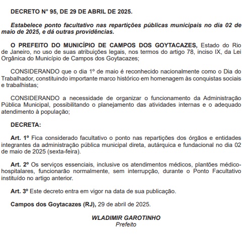 A Prefeitura de Campos publicou no Diário Oficial desta terça-feira (29) o ponto facultativo nas repartições públicas municipais na próxima sexta-feira (2). A data cai um dia após o feriado nacional do Dia do Trabalhador, que será no dia 1º de maio.
